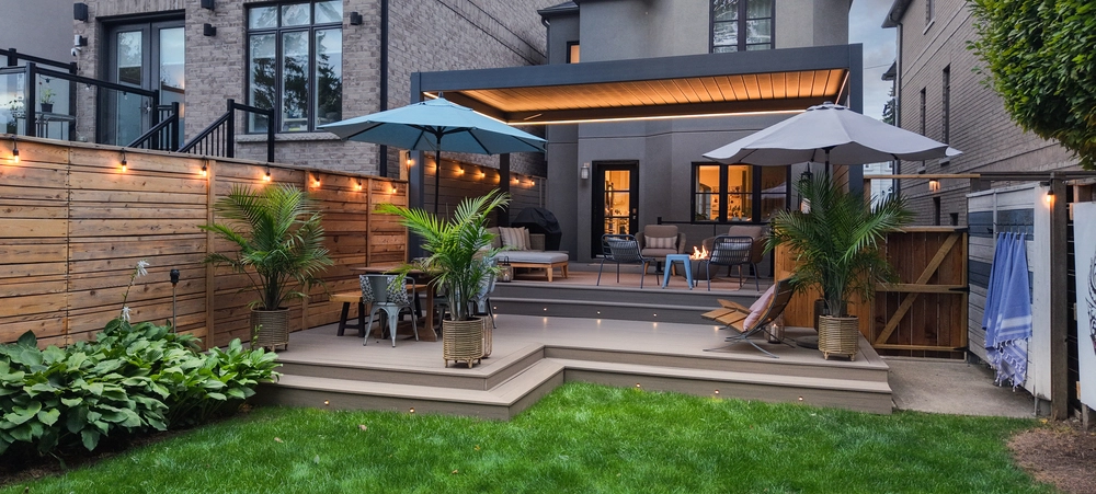 Green Side Up Contracting's backyard renovation project with brand new multilevel deck with stairs and pergola and fencing